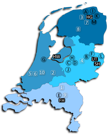 As learning communities are often strongly tied to regional public-private partnerships, we also took a regional approach while building the consortium. We distinguish four regions, as depicted in Figure 1. The consortium consists of one university (main applicant, UT) and four universities of applied sciences (SH, HG, HW, FH, see map) as co-applicants. In addition, the consortium includes 13 starting and experienced learning communities (see A-M on the map), and 10 national and regional partners that provide expertise to develop the project and disseminate the outcomes.